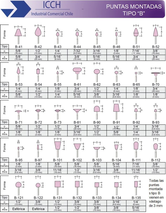 Nota: Fabricamos también puntas montadas especiales de acuerdo con las peticiones de nuestros clientes. Para otras especificaciones y dimensiones, consulte con nuestro departamento comercial